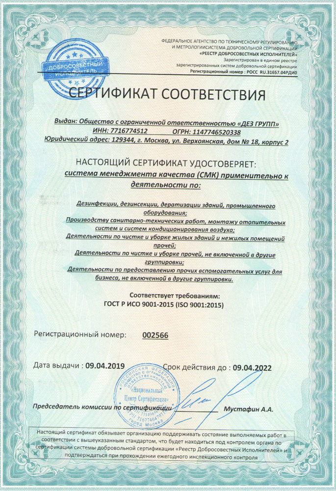 Мы состоим на учете в Роспотребнадзоре, как официальная СЭС, действующая на территории Москвы и Московской области.